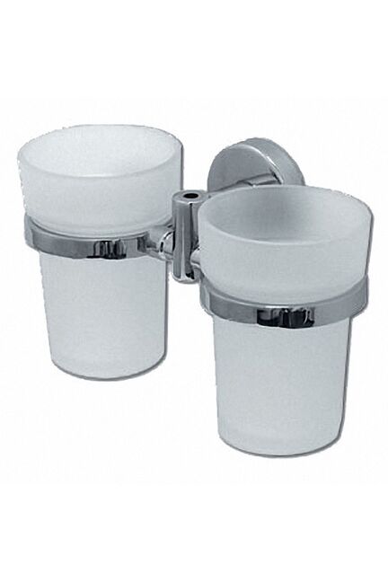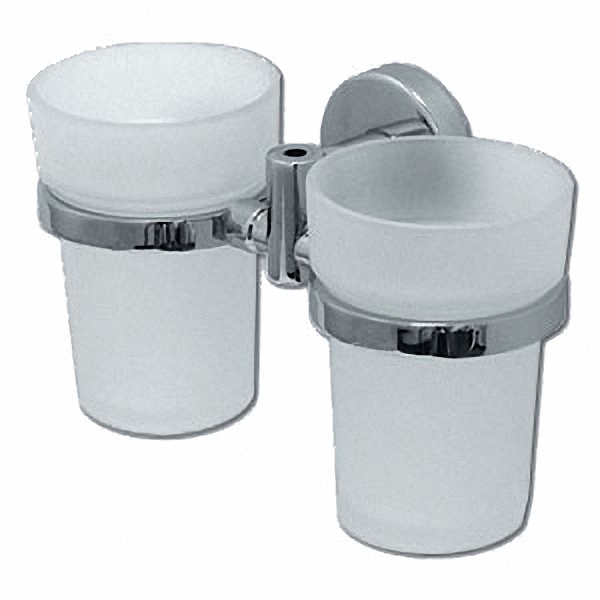Двойной настенный стакан из хромированного металла и матового стекла для удобного и гигиеничного хранения зубных щёток и пасты.
