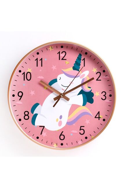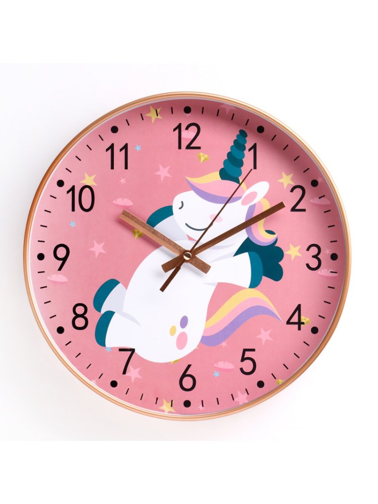Яркие часы диаметром 30 см с бесшумным механизмом для детских комнат, крупные цифры, прочный корпус, стильный дизайн с единорогом.