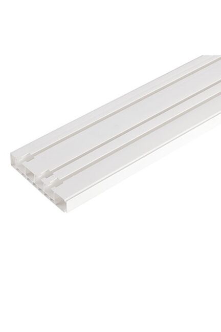 Комплектующие к карнизу: ПВХ-шина 2-х или 3-х полозная, крючки роликовые, стопоры. Карниз имеет индивидуальную упаковку Трёхрядный карниз 2,5 м: прочный пластик, идеален для многослойных штор, подходит для потолочного и настенного монтажа.