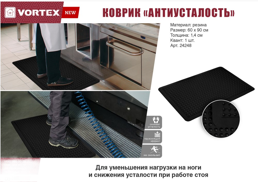 Для уменьшения нагрузки на ноги и снижения усталости при работе стоя. Подходит для использования в мастерских, за прилавком, в гараже, дома, в ресторанах. Резиновый коврик 60×90 см: снижает усталость, не скользит, износостойкий, для рабочих зон и производства, легко моется и быстро сохнет.