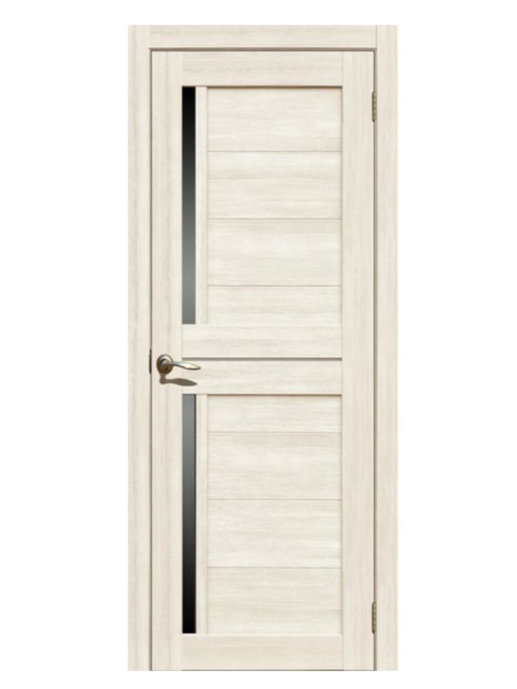коллекция La Stella.царговая конструкция отличается высокой прочностью и многовариантностью отделки. МДФ наполнение двери обладает достаточно высокой жесткостью и хорошей тепло- и звукоизоляцией. Покрытие двери - Экошпон - защищает ее от высокой влажности и любых механических повреждений Светлое дверное полотно с чёрным стеклом, размер 700 мм, подходит для дома и офиса, прочное, эстетичное и универсальное для разных интерьеров.