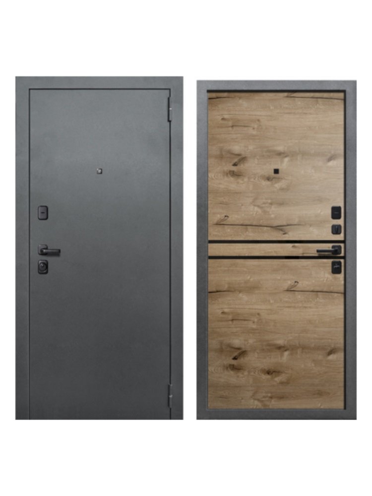 Внешнее покрытие: порошково-полимерное. Толщина полотна 80 мм, глубина короба 105 мм. Толщина стали (полотно, короб): 1,2 мм. Внутренняя отделка: МДФ-панель 10 мм, молдинг чёрный. Наполнение: базальтовая плита. Уплотнение: 2 контура. Основной замок: Гардиан цилиндровый (ключ-вертушка). Дополнительный: Гардиан сувальдный (ключ-ключ). Металлическая дверь с надёжной шумо- и теплоизоляцией, стильной отделкой «дуб пацифик/фуаро», размер 860 мм, идеально для квартиры или дома.