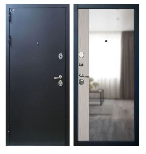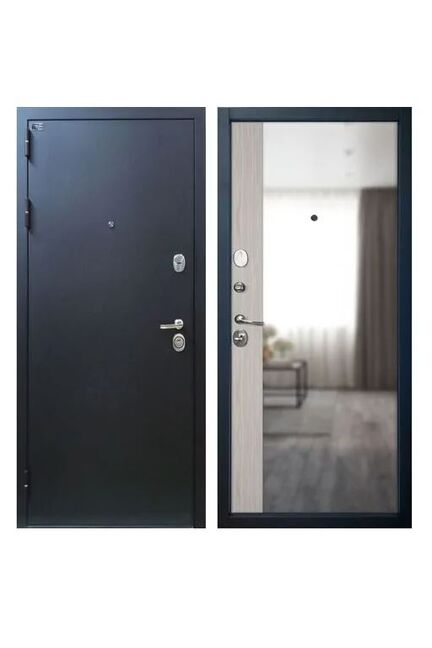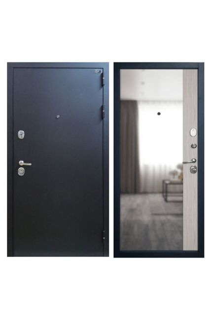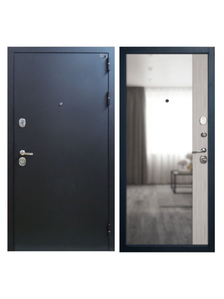 Тип двери: Квартирная входная дверь, для эксплуатации в подъезде.Отделка снаружи: Стальной лист в порошковой окраске.Цвет: Букле черный.Отделка внутри: Декоративная панель MDF 12 мм с зеркалом Maxi Mirror с отделкой PVC/PP Stone Oak.Толщина дверного полотна: 102 мм.Толщина стали полотна: 1,5 мм.Размер дверного блока по коробке:2050х860 мм.Вес дверного блока: 90 кг.Ширина наличника: 80 мм.Тип короба: Открытый.Толщина короба: 117 мм.Толщина стали короба: 1,7 мм.Уплотнение: Три контура высококачественного уплотнителя.На полотне – Schlegel (2 контура). На коробе – EPDM ( 1 контур).Открывание: 180°.Утепление: Наполнение полотна комбинированное из минеральной плиты «Технониколь» (50 мм) и панели пенополистирола (XPS) (30 мм).Усиление: Усиленный лонжерон замка во всю высоту полотна.Профиль усиления на петлевой стороне. Два дополнительных ребра жесткости внутри полотна.Петли: 3 шт., приварные, на упорном подшипнике.Противосъемный штырь: 3 шт. с заглушками-чашками.Крепление: Блок крепится чере Входная дверь с зеркалом