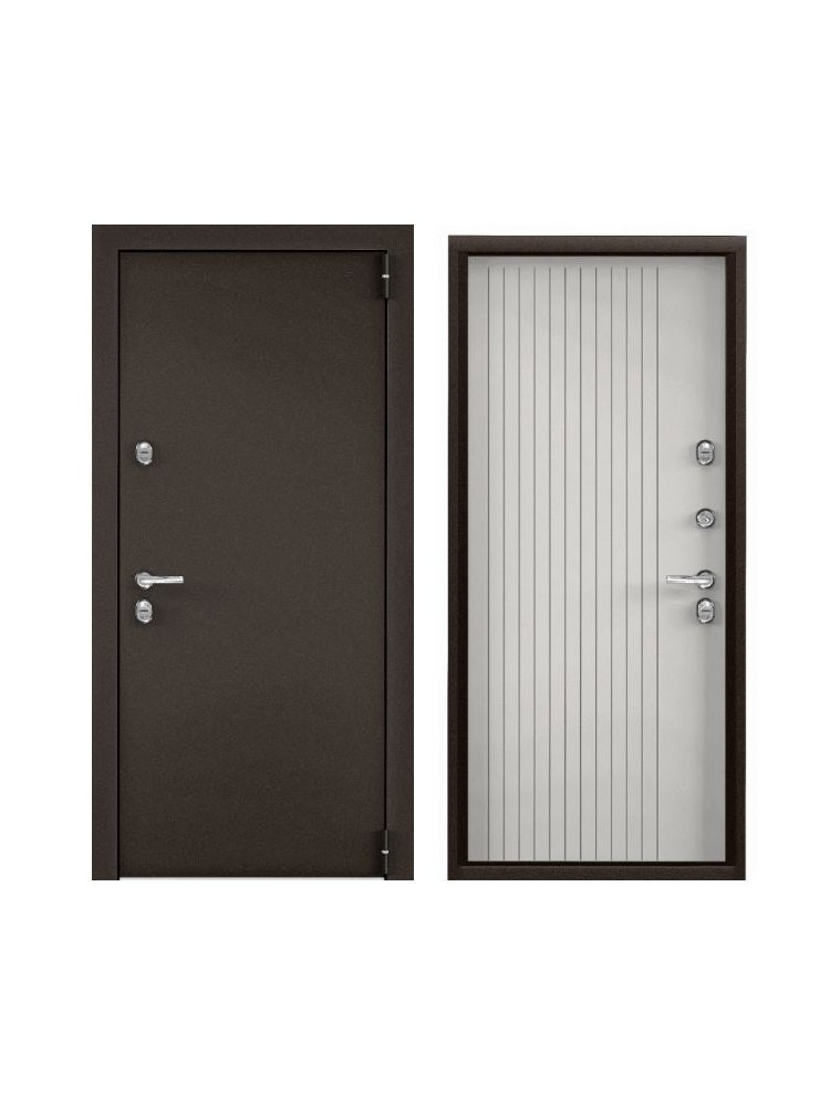 Тип внешней отделки: порошково-полимерное покрытие. Тип внутренней отделки: панель МДФ с ПВХ покрытием. Верхний замок: BORDER 3В 8-8Г/15, 4-го класса взломостойкости по ГОСТ 5089-2011. Нижний замок: Crit A30-4Л, 2-го класса вломостойкости по ГОСТ 5089-2011. Декоративные накладки на ключевину сувальдного замка с направляющими для ключа и подпружиненными шторками от продувания. Противосъемные ригели с петлевой стороны полотна 2 шт. Ночная задвижка.