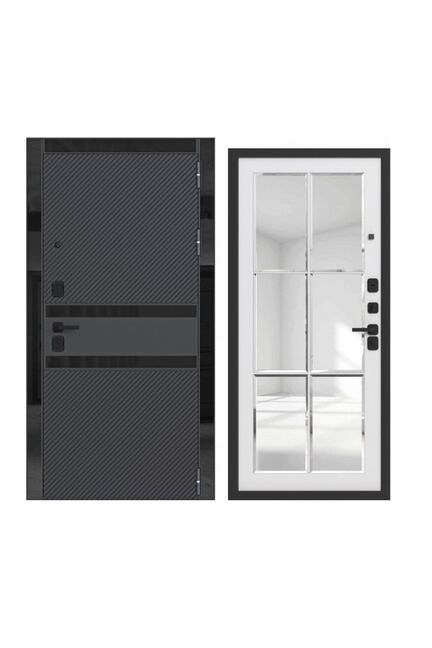 Наличник: МДФ 98 мм., вставки стекло чёрное.Петли: 3 шт., наружные, открывание 180°.Размеры: 960х2050, 860х2050.Ориентация: Правая и левая.Производитель: Россия.Толщина полотна: 90 мм.Глубина коробки: 115 мм.Внешнее покрытие: Порошково-полимерное покрытие Чёрный муар с блёстками. МДФ-панель 16 мм., вставки стекло чёрное с еврокромкой. Цвет: Софт чёрный.Внутреннее покрытие: МДФ-панель 12 мм., зеркало с фацетом. Цвет: Софт белый.Толщина металла: 1,2 мм.Наполнение: Базальтовая плита.Уплотнитель: 3 контура уплотнения.Основной замок: Guardian цилиндровый (ключ-вертушка).Дополнительный замок: Guardian цилиндровый (ключ-ключ).Броненакладка: Есть.Ночная задвижка: Есть.Фурнитура чёрная: Fuaro.