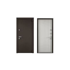 Тип внешней отделки: порошково-полимерное покрытие. Тип внутренней отделки: панель МДФ с ПВХ покрытием. Верхний замок: BORDER 3В 8-8Г/15, 4-го класса взломостойкости по ГОСТ 5089-2011. Нижний замок: Crit A30-4Л, 2-го класса вломостойкости по ГОСТ 5089-2011. Декоративные накладки на ключевину сувальдного замка с направляющими для ключа и подпружиненными шторками от продувания. Противосъемные ригели с петлевой стороны полотна 2 шт. Ночная задвижка. Металлическая дверь, терморазрыв, отличная тепло- и шумоизоляция, защищает от взлома, стильная отделка, размер 950×2050 мм, для дома и офиса.