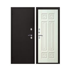 Петли - 2 шт., наружные, открывание 180°. Производитель Россия. Толщина полотна 100 мм. Глубина коробки 126 мм. Внешнее покрытие - Металл полимерно-порошковое покрытие "Букле чёрный". Внутреннее покрытие - МДФ панель 12 мм. "Белое дерево". Толщина металла 1,5 мм. Наполнение - Пенополистирол 84 мм. Уплотнитель 3 контура D-образный. Основной замок - Аргус сувальдный ключ/ключ. Дополнительный замок - Аргус сувальдный ключ/ключ. Броненакладка - есть. Ночная задвижка - независимая. Фурнитура - хром. Терморазрыв- на полотне и коробке.