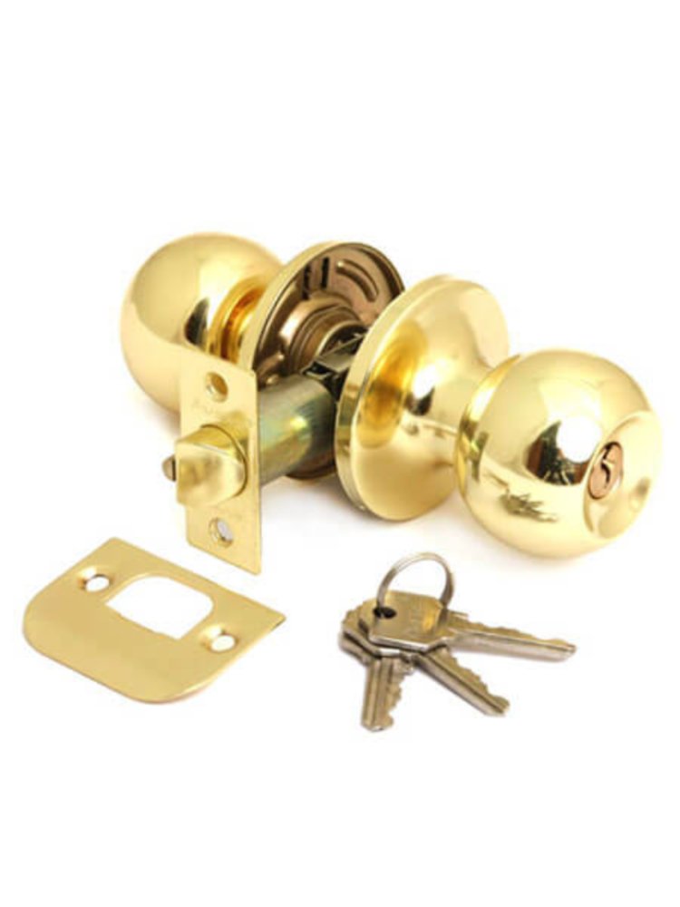 Надёжная защёлка-ручка с ключом и фиксатором в золотом цвете для межкомнатных дверей, проста в установке и устойчива к износу.