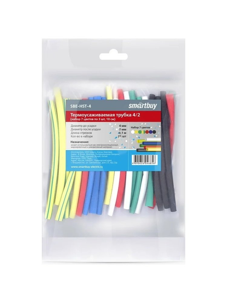 Диаметр до усадки 4 мм; Диаметр после усадки: 2 мм; Длина: 100 мм; Цвета: белый, красный, синий, зеленый, черный, желтый, желто-зеленый; Термоусадочные трубки 4/2 мм, 7 цветов по 3 шт, длина 10 см, надежная изоляция и маркировка проводов в электромонтаже и ремонте.