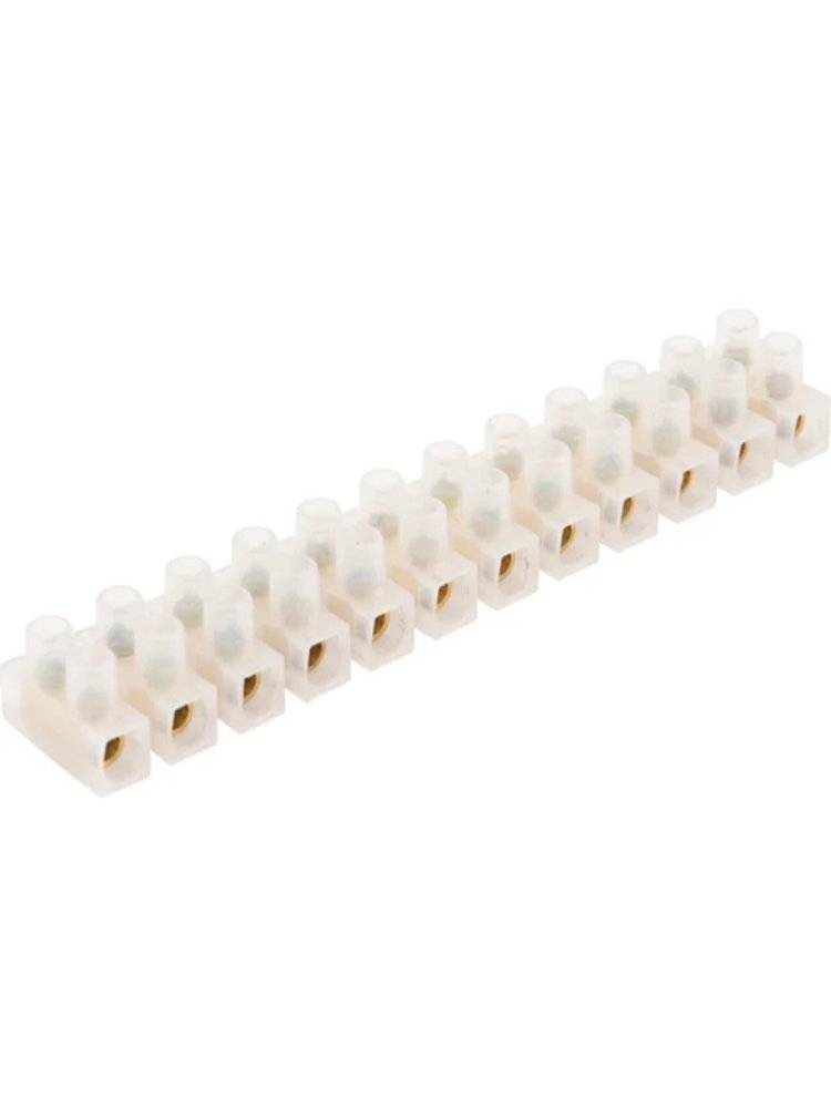 Винтовая клеммная колодка на 12 контактов, 16А, для проводов 4–12 мм², из прочного белого полиэтилена, обеспечивает надёжное электрическое соединение.