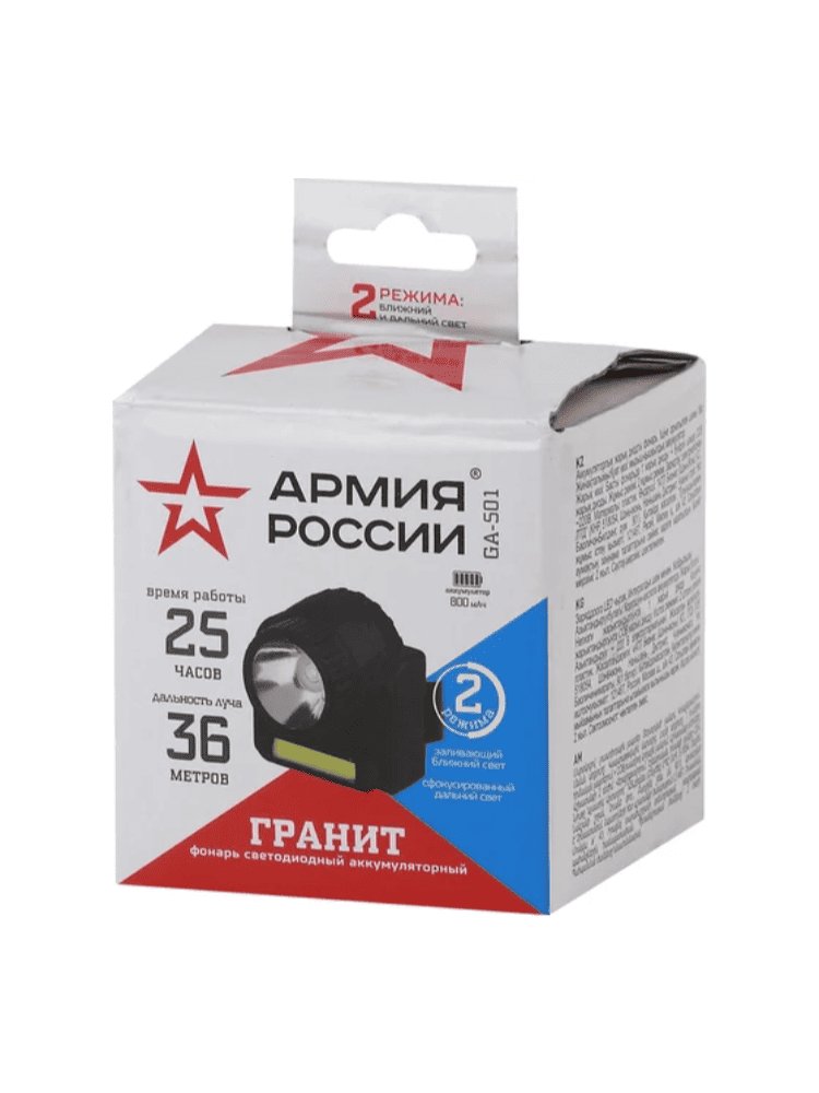 Фонарь налобный GA-501, 3Вт COB + 3Вт LED, 2реж. АРМИЯ РОССИИ в Солнечный