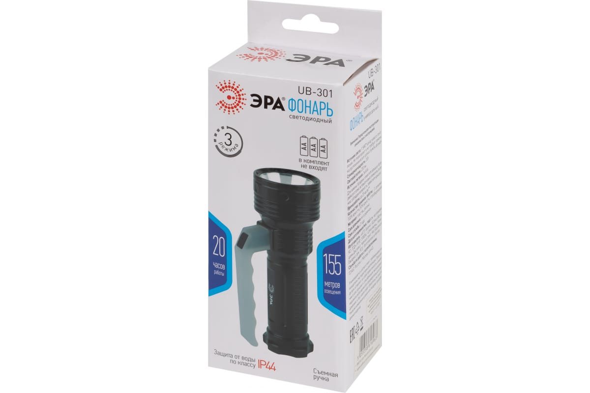 Светодиодный фонарь ЭРА UB-301 универсальный на батарейках 3Вт - компактный светодиодный фонарь с удобной съёмной ручкой, защитой от воды и 3 режимами работы: максимальная яркость, 50% яркости, стробирование. В основе SMD-диод нового поколения - не тускнеет и не требует замены с течением времени. Ручной портативный фонарь от ЭРА работает от 3 пальчиковых батареек (3 х АА, в комплект не входят). После установки новых элементов питания непрерывно светит 20 часов. Обеспечивает 155 метров освещения! Повышенный световой поток - 230 Лм. Можно применять во влажном климате, в любую погоду - IP44. Станет вашим надежным помощником в любой ситуации! Мощный COB-фонарь 3 Вт на 3 батарейках AA, прочный корпус, легкий и компактный для строительных и бытовых задач, удобен для работы и отдыха.