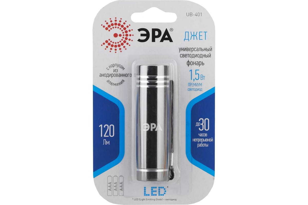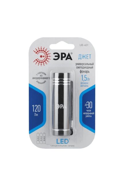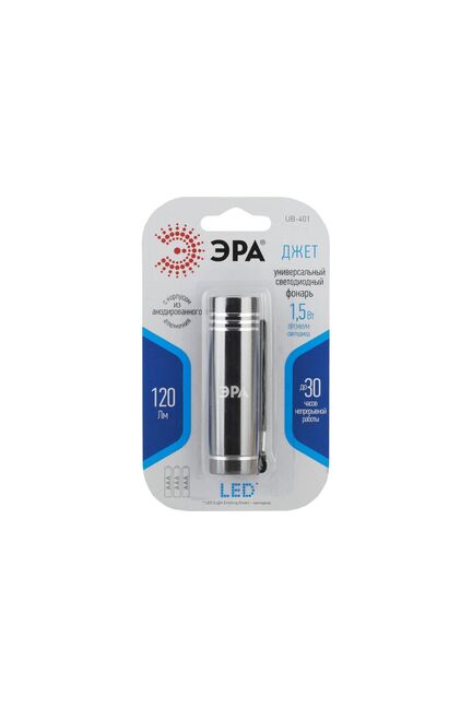 Универсальный фонарь ЭРА UB-401 Джет 1,5Вт COB, алюминий, 3xAAA, с корпусом из анодированного алюминия. Такой корпус очень надёжный, не подвергается коррозии, очень прочный и долговечный. Этот фонарь компактный и очень простой, он создан для повседневного использования в быту. Именно поэтому он сделан из качественного материала. Особенность светодиодных фонарей ЭРА - светодиоды нового поколения. В фонаре "Джет" использованы светодиоды премиум класса, они на 50% ярче стандартных и имеют цветовую температуру 6000К. Это значит, фонарь светит ярким белым светом, приближенным к естественному, и не отдаёт в синеву. Фонарь обеспечивает до 30 часов непрерывной работы с мощностью в 1,5 Вт. Этого более чем достаточно для использования в городских условиях. Дальность луча "Джет" - 120 метров. Фонарик легко носить и хранить, с ремешком, который позволит прицепить фонарик к карману или повесить на сумку. "Джет" - маленький, качественный фонарик для самых разных бытовых нужд. Компактный фонарь: COB 1,5Вт, работает от 3х A