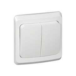 Двухклавишный выключатель с подсветкой, ток 10А, для открытой установки. Идеален для управления двумя зонами освещения. Белый цвет, быстрый монтаж.