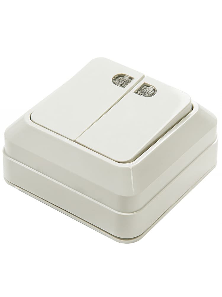 Светлый двойной выключатель с подсветкой, для наружной установки, прочный корпус, две клавиши и быстрая установка без штробления стен.