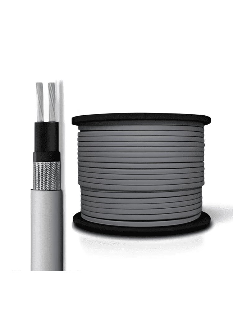 Греющий кабель сконструирован из двух параллельных проводников, по которым при его использовании течёт переменный ток (220 В, 50 Гц). Проводники соединены матрицей из полимерного материала, в который добавлен углерод. Такая матрица представляет собой полупроводник с непостоянным электрическим сопротивлением. Оно меняется по следующим правилам: ― при понижении температуры окружающей среды (и, следовательно, матрицы) её сопротивление растёт. Это влечёт за собой повышение температуры кабеля и канализационной трубы, на которой он закреплён. Саморегулирующийся греющий кабель 30Вт/м для надежной защиты труб от замерзания, экономит энергию и прост в установке даже при низких температурах.