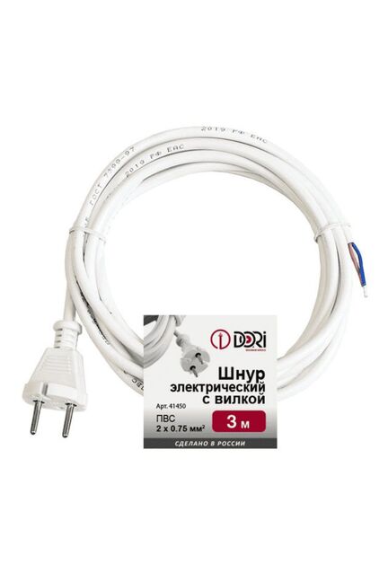 Шнур с вилкой 3м белый ПВС 2*0,75 в Солнечный