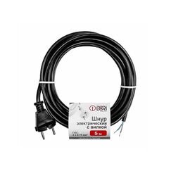 Пяти метровый гибкий шнур с вилкой для подключения электроинструментов и техники, надежная изоляция, сечение 2×0,75 мм², быстрая и простая установка.