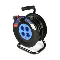 Номинальное напряжение: 250 В; Частота: 50 Гц; Номинальный ток: 16 А; Тип провода: ПВС 3x1,5мм2; Материал корпуса: АБС-пластик; Климатическое исполнение: УХЛ-3; Степень защиты от влаги и пыли: IP-40; Цвет: черный/синий Удлинитель на катушке 30м, 4 розетки с заземлением, ПВС 3х1,5 мм², 16А, IP40 — оптимально для строительных и бытовых работ.