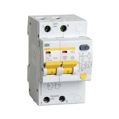 Дифференциальный автомат 2P 63A 30мА IEK защищает от перегрузок, коротких замыканий и утечек тока, подходит для бытового и промышленного применения.