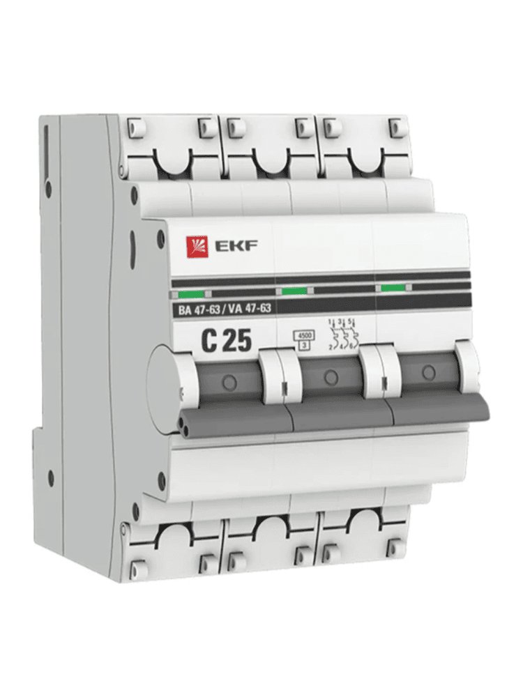 Автоматический выключатель 3P 25A (C) 4,5кА BA 47-63 от EKF PROxima представляет собой надежное устройство для защиты электрических цепей от перегрузок и коротких замыканий. Этот трехполюсный автоматический выключатель рассчитан на номинальный ток 25 А и обладает отключающей способностью 4,5 кА, что обеспечивает эффективную защиту оборудования и проводки. Устройство отличается компактными размерами, что упрощает его монтаж в распределительных щитах. Корпус выполнен из высококачественного пластика, устойчивого к механическим повреждениям и воздействию окружающей среды. Прибор соответствует современным стандартам безопасности и имеет длительный срок службы. Подходит для использования в бытовых, коммерческих и промышленных системах электроснабжения.