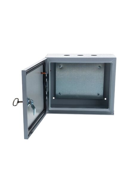 Корпус оснащён съёмной монтажной панелью, выполнен из стали толщиной 1,0 мм, окрашен термоустойчивой порошковой эмалью, степень защиты IP54 обеспечивает надежную защиту от пыли и влаги, двери фиксируются на металлической петле и оснащены замком. Удобный вывод кабеля предусмотрен с сальниковыми отверстиями на верхней и нижней стенках. Компактные габариты 250×300×155 мм позволяют размещать устройство в условиях ограниченного пространства.