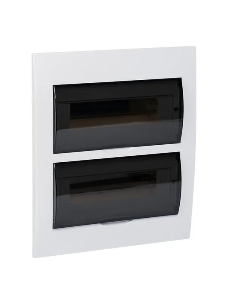 Пластиковый щит на 24 модуля c прозрачной дверцей, скрытый монтаж, IP41, белый, компактность и простая установка для уверенной электробезопасности.