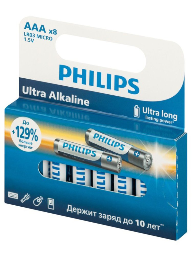 Батарейки Philips представляют собой набор из 8 алкалиновых батареек типа AAА с напряжением 1,5V. Они идеально подходят для использования в энергоемких устройствах. Ультра-щелочные батарейки AAA (8 шт.), повышенная ёмкость, защита от протечек, идеально для профессиональных инструментов и техники.
