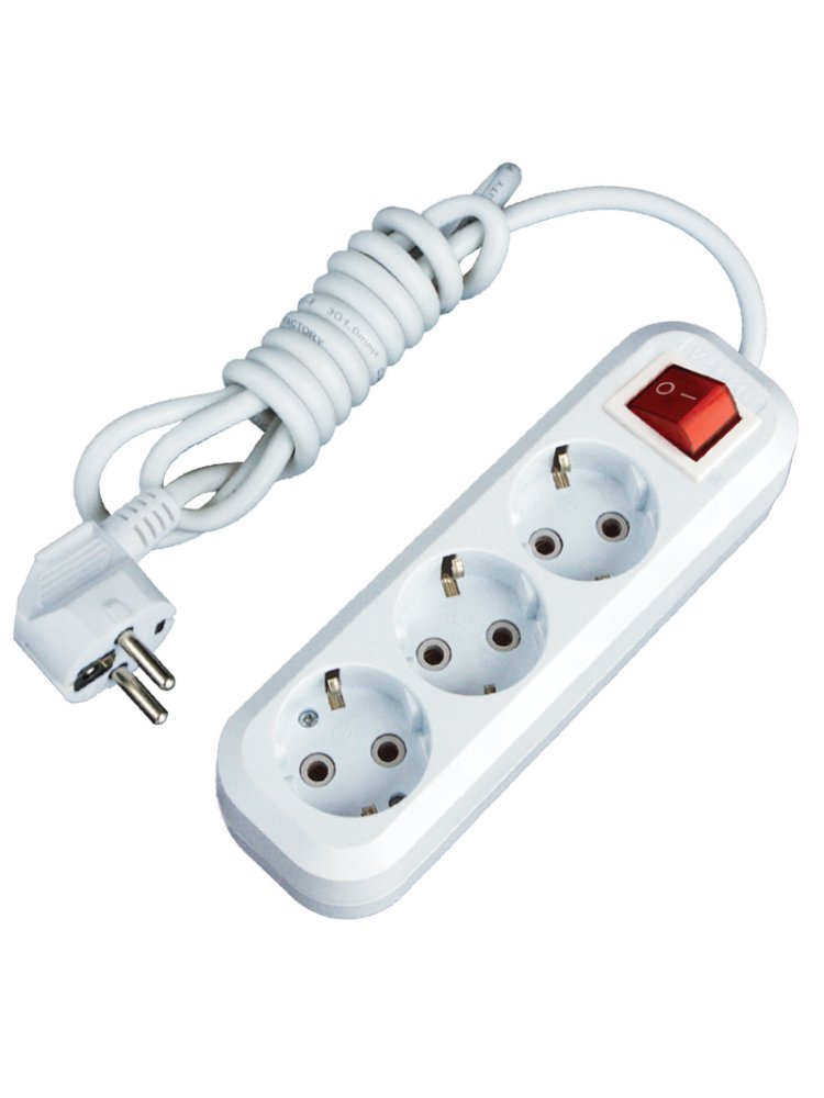 Удлинитель 3 метра, три заземлённых гнезда, выдерживает нагрузку до 13А, с выключателем — для безопасного и удобного подключения инструментов.
