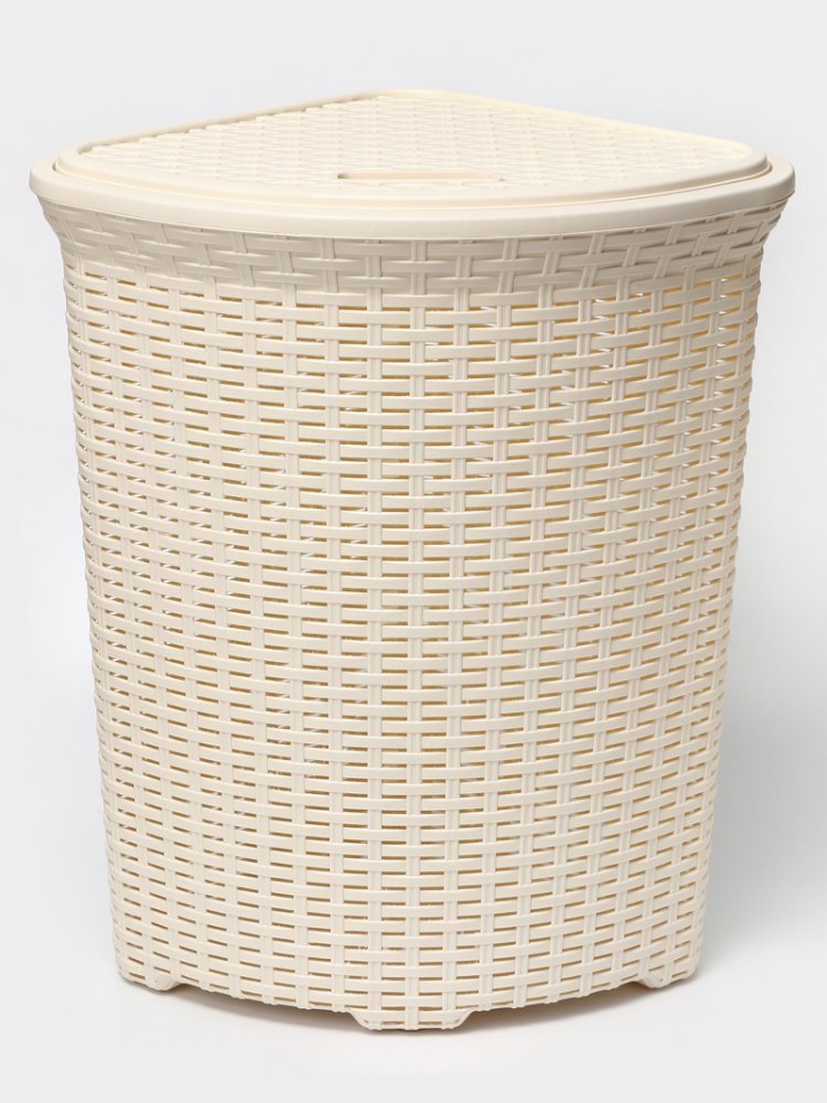 Размер (Д*Ш*В): 40*40*57 см Угловая корзина 60 л с крышкой, ротанг, прочный пластик, вентиляция, для белья и текстиля, компактное размещение, цвет слоновая кость.