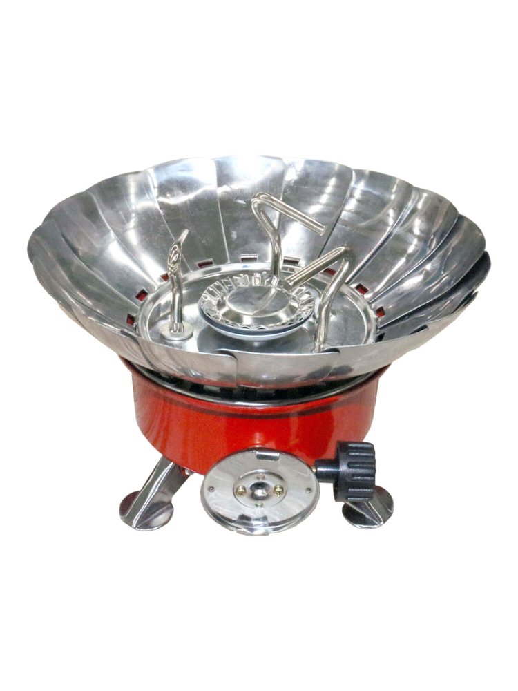 Плита снабжена специальным механизмом в виде раскладывающихся «лепестков» из нержавеющей стали предохраняющих пламя от задувания ветром во время приготовления пищи. Компактная газовая мини-плита с мощностью 1,8 кВт, ветрозащитой и цанговым баллоном для приготовления пищи на стройке, даче и отдыхе.