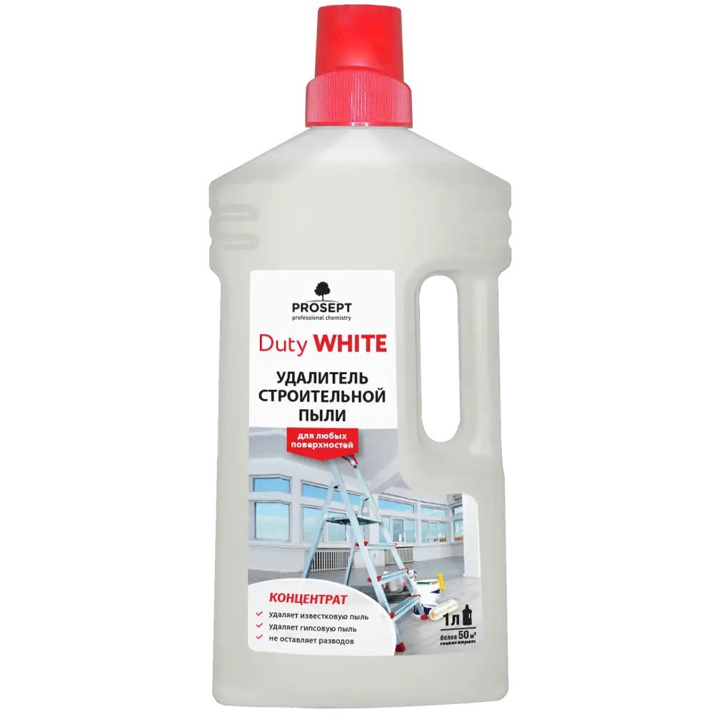 Duty White – нейтральное моющее средство специального назначения. Удаляет известковые и гипсовые отделочные растворы. Связывает микрочастицы пыли и соли жесткости. Удаляет разводы от других моющих средств с зеркальной плитки и иных глянцевых поверхностей. Не содержит агрессивных веществ, растворителей и щелочей. Область применения: средство применяется для мойки поверхностей на объектах строительства, при ремонте зданий и сооружений, при мойке потолков, полов и стен производственных помещений на промышленных предприятиях различного профиля. Рекомендуется при уборке стройплощадок после побелочных, гипрочно-стружечных и иных работ.