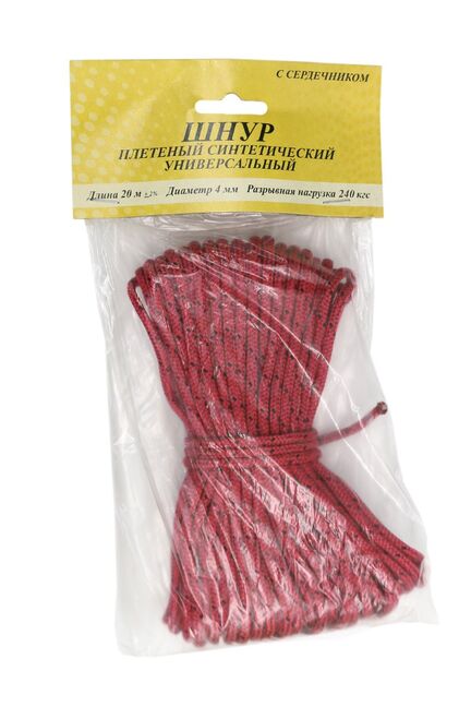 Полипропиленовый шнур 4 мм с сердечником, длина 20 м. Прочный, не впитывает влагу, устойчив к истиранию — для любых строительных и хозяйственных работ.