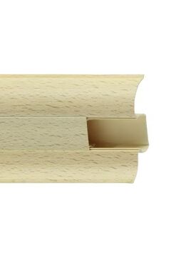 Утонченный и высокий профиль (58 мм) с острыми краями. Благодаря съёмной панели монтаж электрических проводов, покраска стен, оклеивание обоями возможны без демонтажа профилей. Конструкция позволяет монтировать и демонтировать плинтус без использования инструментов. Существует возможность размещения большого количества проводов, в том числе после монтажа. Специальная двухслойная технология: помимо слоя краски, дополнительно покрывается специальным лаком, благодаря чему его покрытие становится однородным, а это дополнительно защищает изделие от разного вида механических повреждений и вредного воздействия лучей УФ. Благодаря эластичному материалу, плинтус идеально прилегает даже к неровностям стен и полов. Высокий ПВХ-плинтус 58 мм, длина 2,5 м, натуральный бук, для маскировки кабелей и эстетичного завершения пола в любых интерьерах.