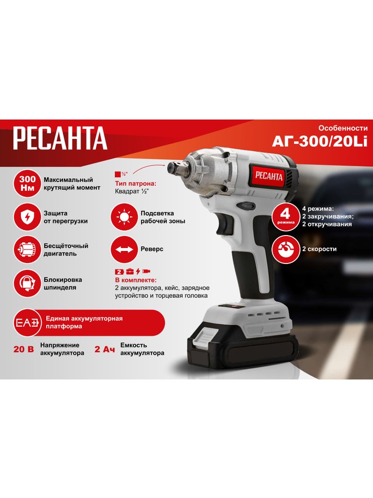 Гайковерт акк. РЕСАНТА АГ-300/20L 20В, 300 Нм, 2*2Ач, бесщеточный, кейс