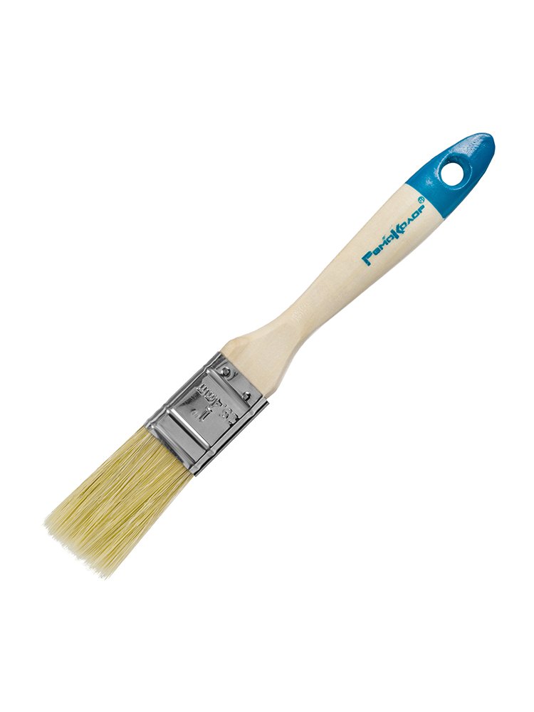 Натуральная светлая щетина. Предназначена для всех типов лакокрасочных материалов. Кончики щетины на конце расщеплены для лучшей впитываемости краски. Бандаж изготовлен из жести. Для надежного удержания щетины используется клей на эпоксидной основе и деревянные клинья. Рукоятка деревянная покрыта лаком. Кончик кисти окрашен цветной краской. Плоская кисть 25 мм с натуральной щетиной — для точной и аккуратной покраски лакокрасочными материалами. Удобна, долговечна, минимальное выпадение ворса.