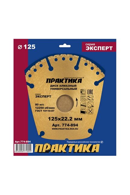 Диск алмазный сегментный Эксперт-Универсал (125х22.2 мм) ПРАКТИКА предназначен для ручных резчиков. Применяется для сухой резки любых материалов от абразивных (асфальт, силикатный кирпич) до металлических профилей и дерева. Вентилируемая конструкция тела диска обеспечивает воздушное охлаждение и предотвращение перегрева. Идеально подходит для пиления материалов неоднородного состава: армированный бетон, перекрытия крыши с деревянной или металлической обрешеткой, перегородки с профилями и наполнителями, вскрытия полов. Рекомендован в качестве спасательных работ для оперативного вскрытия металлических дверей, перегородок крыш, пиления твердых металлических изделий: замков, стержней, пальцев, пружин, валов, дверных петель.