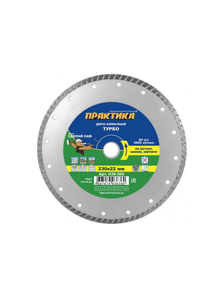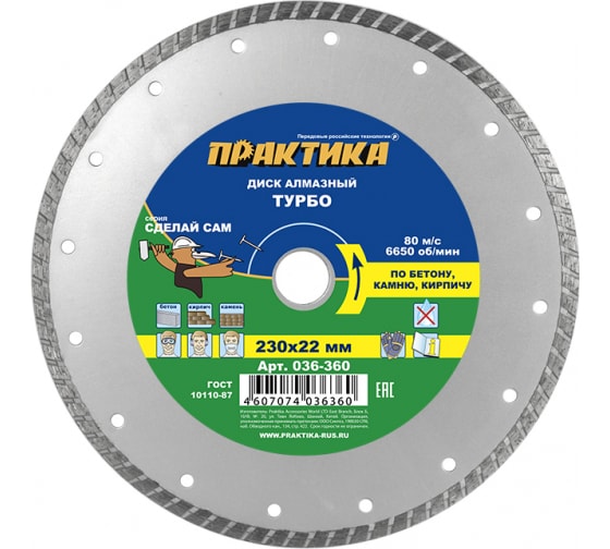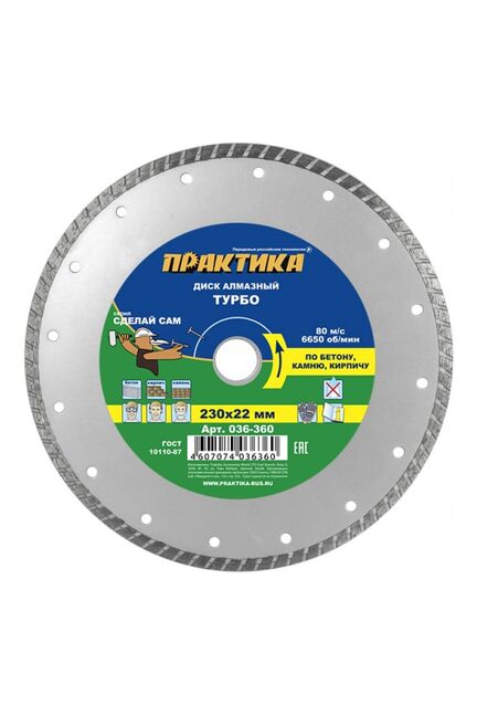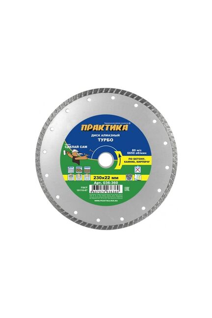 Турбированный диск 230 мм для точного и быстрого реза бетона, кирпича и плитки. Усиленная кромка и чистота среза для профессиональных задач.