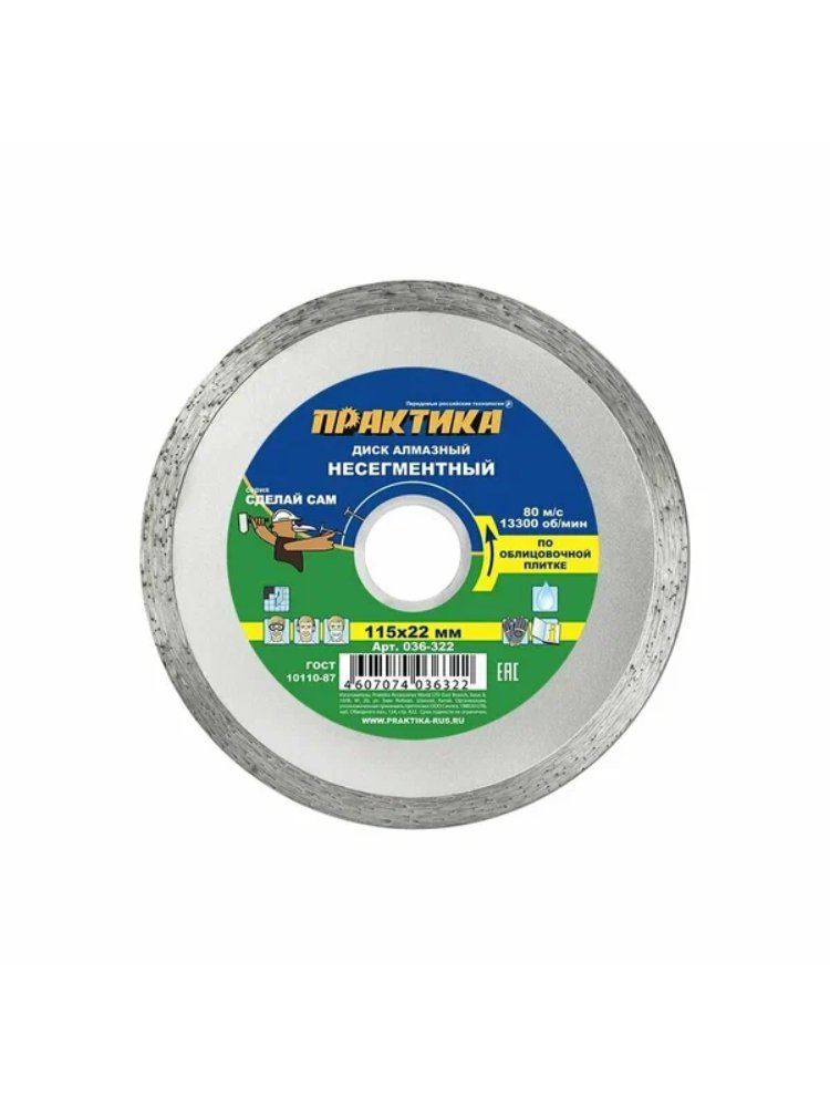 Диск алмазный несегментный ПРАКТИКА "Сделай Сам" 115х22 мм для керамической плитки