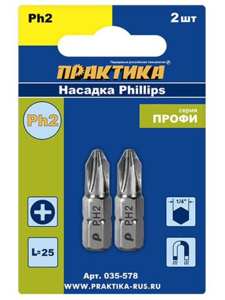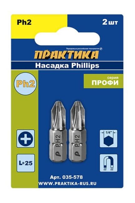 Насадки отверточные Phillips. Магнитные. Серия "Профи". Шурупы с крестообразным шлицем Phillips наиболее распространены на рынке благодаря простой технологии изготовления и удобству работы при средней длине шурупа (40-60 мм), что позволяет их массово применять при монтаже гипсокартона, сборке деревянных и легких металлических конструкций. Именно поэтому к данному типу насадок профессионалы предъявляют наиболее высокие требования. Бита PH2, 25 мм, 2 шт — для шуруповерта, износостойкая сталь, магнитный наконечник, надежность крепления и универсальность применения.