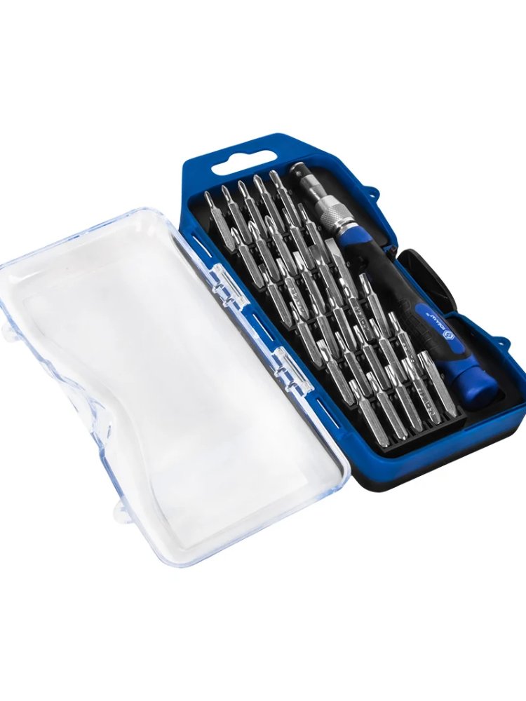 Отвёрточная рукоятка в наборе оснащена встроенным магнитом, благодаря которому биты надёжно зафиксированы при работе. Рукоятка и бита в составе набора выполнена из хром-ванадиевой стали. Компактный кейс выполнен из пластика с резиновыми вставками. Удлинитель Телескопическая отвёрточная рукоятка Биты: PH000, PH00, PH0, PH1, PH2, PZ00, PZ0, PZ1 SL1, SL1.5, SL2, SL2.5, SL3, SL3.5, SL4, T4, T5, T6, T7, T8, T9, T10, T15, T20, HEX 0.9, HEX 1.3, HEX 1.5, HEX 2, HEX 2.5, HEX 3. Универсальный набор: 32 биты и удобная отвертка для всех видов крепежа. Прочный кейс, надежная сталь, высокая износостойкость и полный комплект насадок.