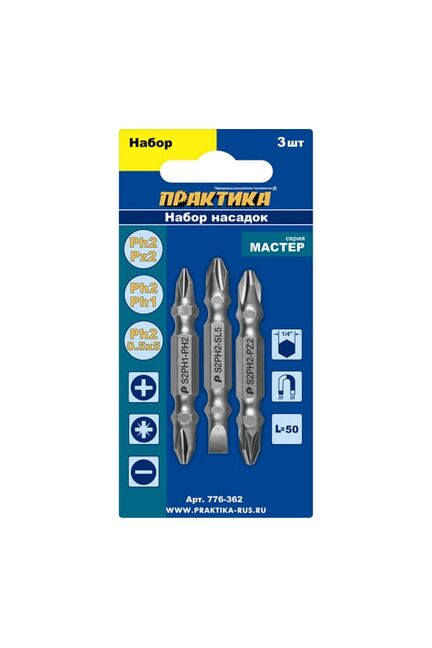 Набор бит ПРАКТИКА "Мастер" PH2/PZ2, PH2/PH1, PH2/SL0.8-5, 50 мм, 3 шт