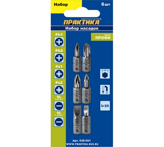 тип бит - односторонние, количество бит - 6 шт, материал бит - CrV, длина бит - 25 мм, torx (TT) - нет, хвостовик бит - 1/4 (тип С), держатель бит - нет, адаптер - нет, ударные (торсионные) биты - нет, цветная маркировка шлица - нет, футляр - нет, форма наконечника бит - PH, PZ, SL, магнитный наконечник биты - нет