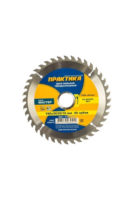 Пильные диски по дереву и ДСП. ГОСТ 9769-79. Серия "Мастер". Высококачественные пильные диски для ручных дисковых пил и станков. Твердость тела HRC 45-46, напаек из карбида вольфрама (сплав ВК8) HRC. 90-93. Угол атаки зуба + 15°. Пильный диск 190 мм, 40 зубьев, подходит для чистого реза дерева, ДСП, высокой износостойкости и универсальности, посадка 30/20 мм.