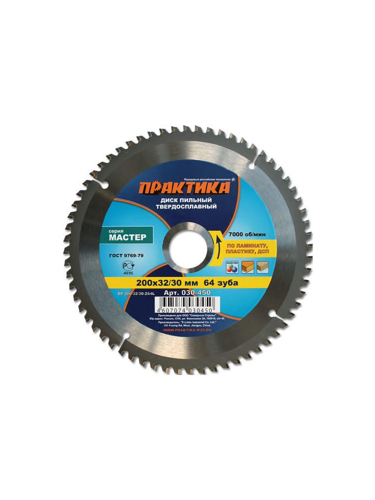 Пильные диски по ламинированным материалам, ДСП, пластику. ГОСТ 9769-79. Серия "Мастер". Высококачественные пильные диски для ручных дисковых пил и станков. Твердость тела HRC 45-46, напаек из карбида вольфрама (сплав ВК8) HRC. 90-93. Угол атаки зуба + 10°. Пильный диск 200 мм, 64 зуба, чистый распил ламината и ДСП без сколов, универсальная посадка 32/30 мм, длительный ресурс и точность реза.