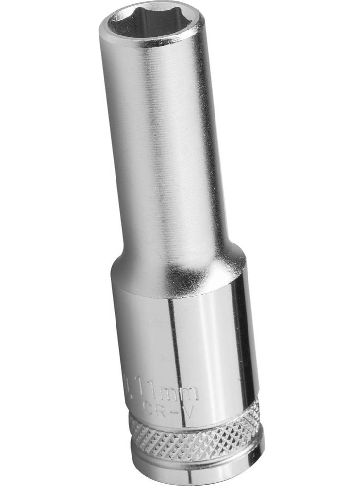 Профессиональный инструмент. Обладает высоким ресурсом даже при интенсивных работах Удлинённая головка 1/2" 10 мм для работы с труднодоступным крепежом, надёжная сталь CrV, стойкость к износу, шестигранный профиль FLANK.