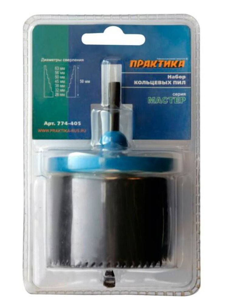 - В комплекте — 7 коронок диаметров 26–63 мм, адаптер и центрирующее сверло