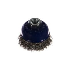 посадка - М14, материал проволоки - сталь, форма проволоки - витая, толщина проволоки - 0,5 мм, диаметр - 75 мм, максимальная скорость - 12500 об/мин Усиленная чашеобразная кордщетка 75 мм с витой проволокой, резьба М14. Идеальна для быстрой очистки металла и сварных швов без повреждений.