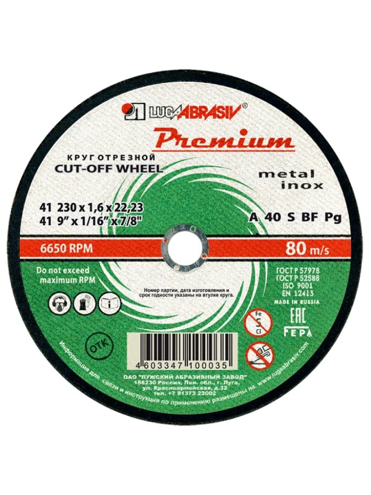 Круг отрезной по металлу и нерж. ЛУГА Premium 230*1,6*22мм.