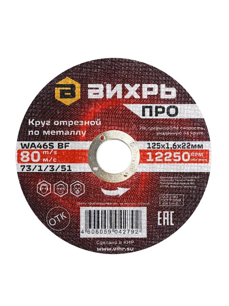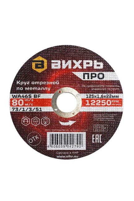 Круг отрезной по металлу ВИХРЬ ПРО 125х1,6х22 мм